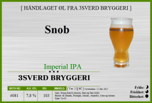 Snob er en vestlig ladet firecracker. Denne Imperial India Pale Ale skyter rett til den bitre kanten før den faller inn i en myk tåke. Dyp gull og klar til å reise inn i universet.